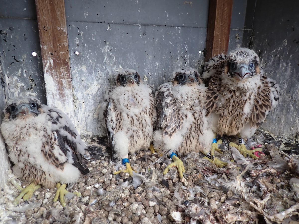 Od ornitologa Václava Berana, pracovníka společnosti ALKA Wildlife, o. p. s., dostalo každé ze sokolích mláďat dva hliníkové kroužky. Jeden značí, že jde o sokola z České republiky. Ten se kontroluje při odchytu, druhý pak umožňuje kontrolu na dálku pomocí dalekohledu. „Právě díky kroužkům a fotopasti, jsme mohli identifikovat rodičovský pár“, konstatoval po prostudování fotografií z fotopasti Václav Beran, výzkumný pracovník ALKA Wildlife, o. p. s., jinak také zoolog a kurátor sbírky Muzea města Ústí nad Labem. „Všechna mláďata jsou zdravá, rodiče o ně řádně pečují a zásobují je dostatkem potravy. Opět jde o genderově vyvážený pár, tedy o dvě samičky a dva samečky“. Na ventilačním komíně zůstanou mláďata přibližně ještě jeden až dva měsíce. Pak se rozletí do světa, stejně jako naši hokejisté.